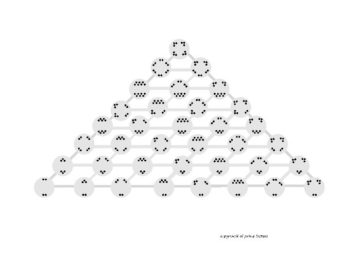 What would multiplication tables look like without any written numbers? Perhaps like the Pyramid of Prime Factors below. Each cluster of dots is a prime number. Within each circle multiply the dots together. To get you started the bottom row is the 2 times table, the right hand side is the 9 times table and the left hand side is each number squared.