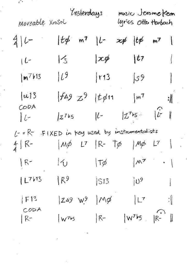 The difference in meaning between lower and uppercase is shown in the jazz standard Yesterdays, given first with l- as the minor tonic playable in any key, followed by the same chords in the key most often used by instrumental players R- aka D minor. After establishing the tonic in the first four bars it begins a journey round the cycle of 5ths from x to w (x t m l r s d f z w).