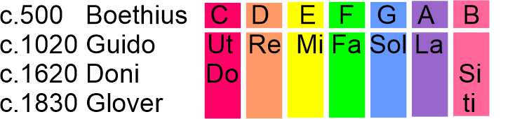 The diagram below summarises the variations Solfa has undergone over the centuries, compared to the alphabetic names attributed to Boethius.