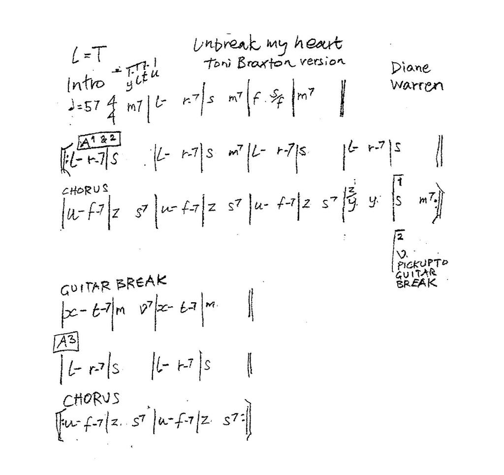 There is beautiful song that offers various way of writing chords in the minor key , that is Unbreak my Heart which I happened to hear on the car radio while making a recycling trip. Toni Braxton in T- (aka B minor) and the chorus moves to R- and guitar break is in F- , in all instances using similar slow moving chords. Toni’s is a most touching rendition and I wrote this harmonic analysis as soon as I got home.