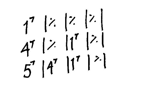 It is interesting to compare how the common root patern 2 5 1 turns out when heading to la as in tØ m7 l- or heading to do as in rØ s7 d-. The 2 5 1 appears again in the 9th bar as d-7 f7 z^ in the first version and w-7 y7 v^ in the second , a rapid modulation to the slattened super tonic, a faily distant key. It could be said that 2 5 1 is the polite way to enter a new key as we saw in bar 6 of All the things you are x-7 t7 m^ and in bar 9 l-7 r7 s^, and later in bar 14 we find v-7 x7 t^ and in bar 21 zØ w7 y^.