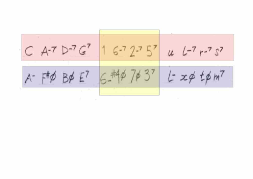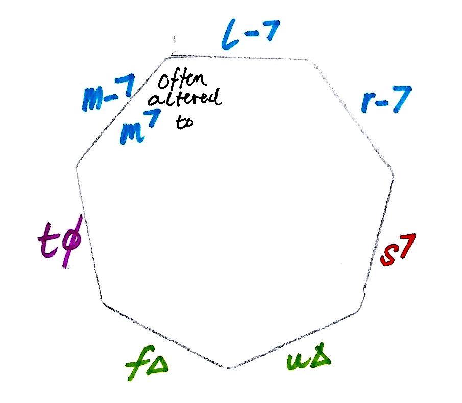 Note there are three minor 7ths chords and two major 7th chords. Two chords are unique, our trfl chord, known as minor 7th b5 or half diminished, and the 7th, though m-7 is often altered to m7 if it is to act as a more typical dominant chord of l- .