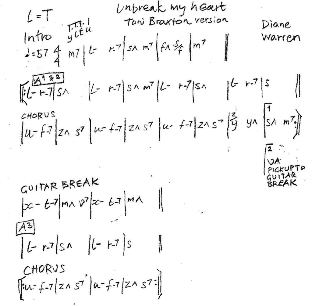 There is beautiful song which offers various way of writing chords in the minor key , that is Unbreak my Heart which I happened to hear on the car radio while making a recycling trip. Toni Braxton in T- (aka B minor) and the chorus moves to R- and guitar break is in F- , in all instances using similar slow moving chords. Toni’s is a most touching rendition and I wrote this harmonic analysis as soon as I got home.