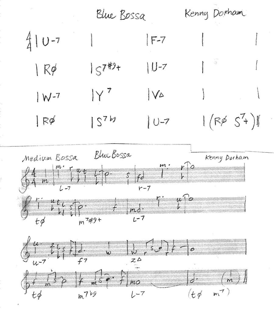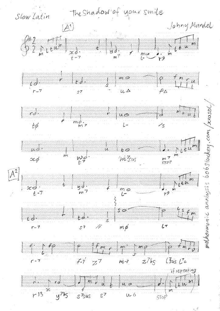 The major scale is ut (aka do) re mi fa la tsi do. The minor scale is la tsi ut re mi fa sol la with two extra members, yu , the leading note and xe if yu is nearby. Bach would never allow xe on its own as it meant a modulation (perhaps to m- ) was on the cards. In this next tune, The Shadow of Your Smile, xe makes a dramatic appearance as soon soon as the first five notes establish la as the tonic, to be soon followed by yu. The minor tonic submits to the major in bars 5 to 8 , regaining its position as tonic in the remaining bars of A1. Yet on the seventh bar of A2 (marked by a wiggly line) the major tonic begins its journey to command the final cadence. In this stave the five lines of the traditional staff are white against a grey background with a couple of grey leger lines, enough for most melodies: the grey makes a nice background for black letters. If you want to experiment with this manuscript paper click on this link.